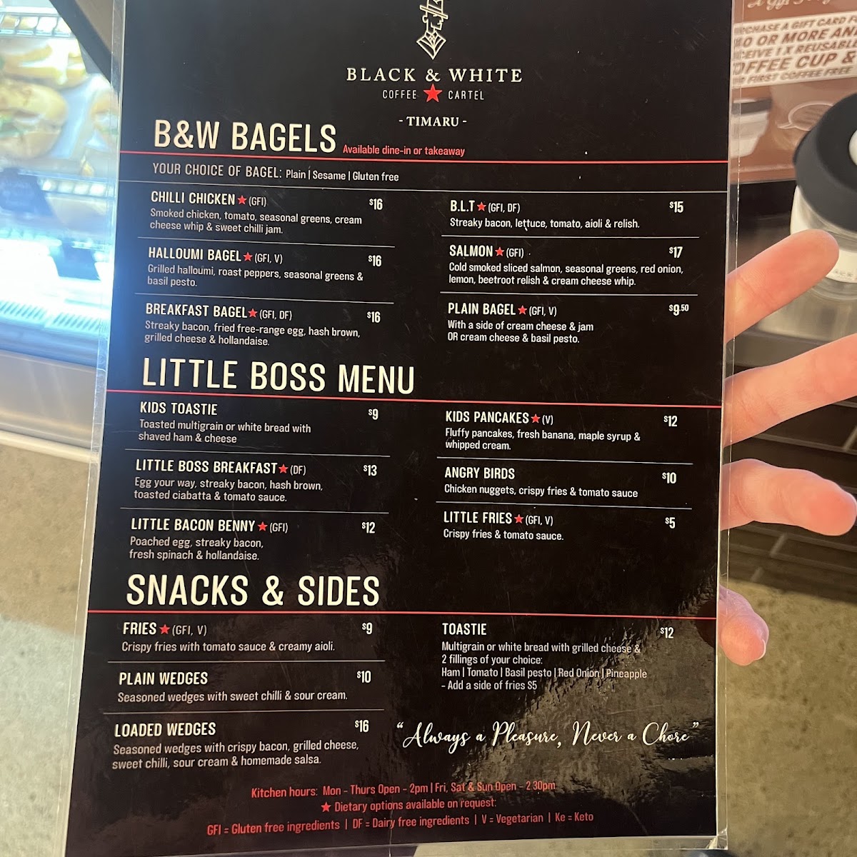 Welcome to Black & White Coffee Cartel Timaru, a charming cafe nestled at 233 Evans Street, Smithfield, where flavor meets community spirit. This cafe is a delightful destination for brunch lovers, featuring an enticing menu crafted with care. From the indulgent B&W Benny eggs benedict to the heartwarming Granola Bowl, each dish showcases quality and creativity.